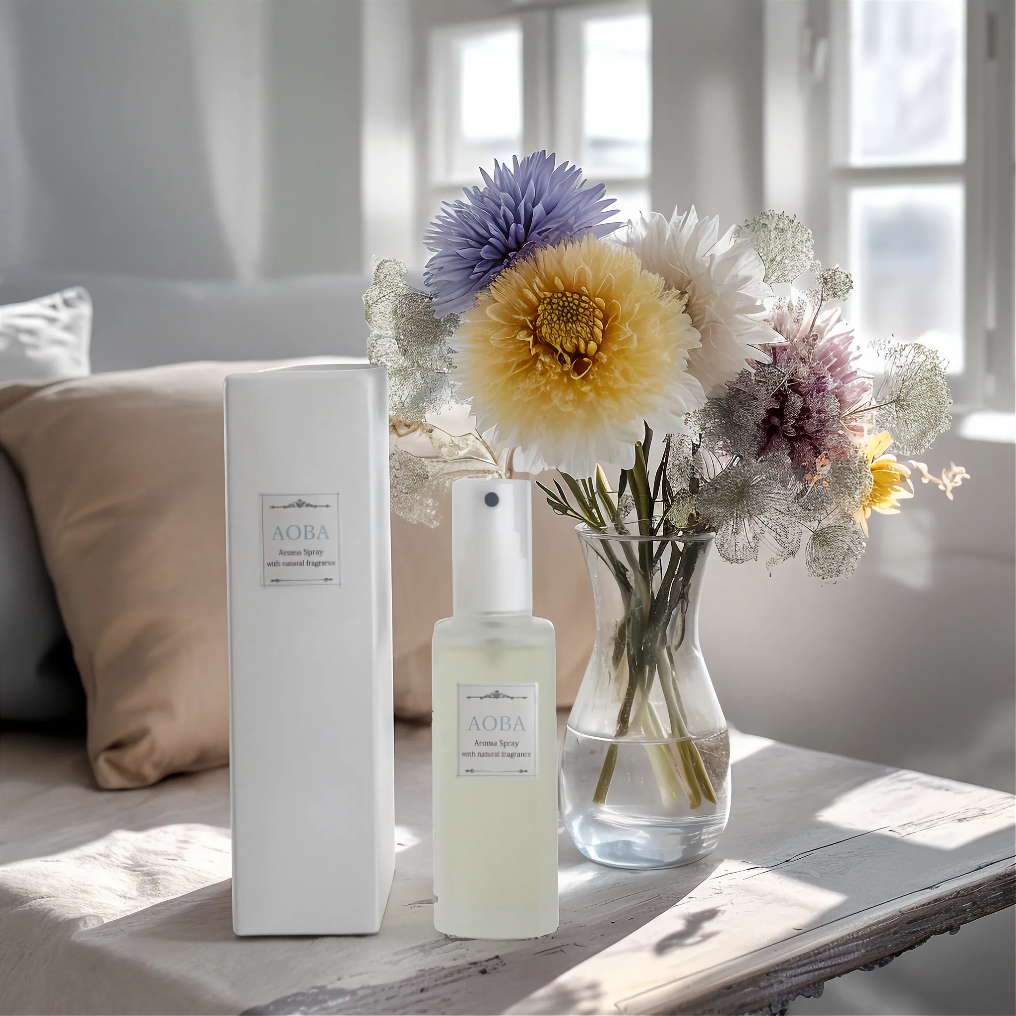 内容物の変質を防ぎ長期の使用にも適したガラス容器(100ml)製のアロマスプレーです。お部屋の空気のリフレッシュにご使用ください。保管時は、直射日光・高温多湿を避けて保管してください。
